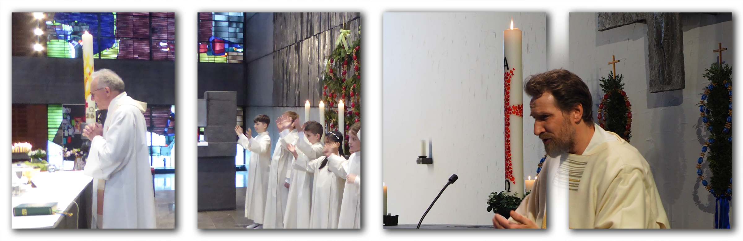 Er begeistert die Menschen für Jesus Christus, für sein Evangelium. Der Geist bewegt die Christen von Anfang an. In der Apostelgeschichte ist immer wieder davon die Rede. Die Lesungen jetzt in der Osterzeit sind oft aus der Apostelgeschichte entnommen. Der Geist begeistert und inspiriert uns. Der Sinn des Lebens ist erfüllt, wo Liebe ist. Unser Jahresthema inspiriert auch die Osterkerze drüben in Jungingen. Auf ihr ist ein großes rotes Kreuz zu sehen. Wenn man genauer hinschaut, entdeckt man: Das Kreuz besteht aus vielen kleinen roten Herzen. Viele einzelne Herzen formen das Kreuz. Viele einzelne Menschen formen und gestalten die Kirche. Viele einzelne Menschen, sie haben ein Herz für die Menschen und für Gott. Sie kommen hierher in die Kirche. Sie feiern den Gottesdienst mit. Sie gestalten den Gottesdienst mit, mit dem, was jede und jeder beitragen kann. Viele einzelne Menschen formen und gestalten Kirche, weit über den Gottesdienst hinaus, im Kirchengemeinderat, in verschiedenen Gruppen und Aktionen, in der Hilfe für Menschen, die Hilfe brauchen. Kirche, Gemeinde, das gibt es, weil viele einzelne Menschen kommen, mitmachen, sich einbringen, regelmäßig, zuverlässig, treu. Kirche, Gemeinde, Gottesdienst, das gibt es, weil Menschen verlässlich da sind, mithelfen, Verantwortung übernehmen. Kirche, Gemeinde, Gottesdienst, würde es das auch geben, wenn wir sagen würden: Ich gehe nur hin, wenn ich Lust dazu habe? Oder: Ich gehe nur hin, wenn ich nichts Besseres vorhabe, an diesem Sonntag, an diesem Wochenende? Wir sind eine Solidargemeinschaft. Vor einiger Zeit ist eine junge Frau, die aus der Kirche ausgetreten war, wieder eingetreten. Ich habe sie gefragt: Warum tun sie das? Ihre Antwort: Ich habe meinen Glauben nie verloren. Er trägt mich und - ich möchte wieder Teil der Solidargemeinschaft Kirche sein. Die Kirche tut so viel Gutes. Ich möchte meinen Teil dazu beitragen. Unsere Kirche, unsere Gemeinde, unsere Gottesdienste, unsere Hilfe für Menschen in Not, das gibt es, weil wir uns aufeinander verlassen können. Unsere Kirche, unsere Gemeinde, unsere Gottesdienste, die gibt es, weil wir uns auf den verlassen können, der uns hier zusammenruft. Die Osterkerze ist sein Zeichen. Er lebt mitten unter uns. Er inspiriert uns. Er begeistert uns. Die Osterkerze in Böfingen wurde von Ricarda Simon gestaltet, die Osterkerze in Jungingen von Thomas Dehm. Beiden danken wir herzlich dafür. Der Sinn des Lebens ist erfüllt, wo Liebe ist.