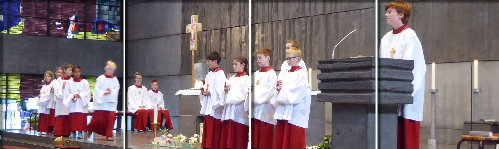 04. Mai morgens um 8.00 Uhr – die ersten Vorbereitungen zur Feier der Firmung mit acht jungen Leuten aus der Gustav-Werner- und Friedrich-von-Bodelschwingh-Schule sind im Gange. Plätze werden reserviert, Liedblätter verteilt, Materialien gerichtet, Stühle gerückt. 9.00 Uhr – die Ministranten eilen herbei. Sie Proben den Ablauf der Firmung, verteilen Aufgaben. Auch draußen auf dem Kirchhof wuseln schon ein paar Damen, die sich um den Stehempfang kümmern. 9.30 Uhr – die Schüler des Chores sind eingetroffen, auch einige Firmlinge sind schon da. Der Bischof kommt an. In der Sakristei, auf dem Kirchplatz, im Gemeindehaus, überall sind geschäftige und auch aufgeregte Menschen. Die Schüler für den Stehempfang informieren sich über ihre Aufgaben. 9.55 Uhr – die Kirchenglocken läuten. Firmbewerber und ihre Paten stellen sich für den Einzug auf. Die Ministranten kommen aus der Sakristei – der große Moment ist da. Einen Moment steht die Zeit still. Die jungen Leute haben sich gut vorbereitet und geübt. Das Fest beginnt. Es ist wahrhaft ein Fest. Ein Spalier von Rollstuhlfahrern säumt den Einzug. Viele Mitschülerinnen und Mitschüler, Lehrerinnen und Lehrer, Verwandte, Bekannte, Menschen aus den Heimatgemeinden und aus Böfingen sind gekommen, um den jungen Leuten den Rücken zu stärken. Mit Begeisterung und Freude sind alle dabei. Für einige Jugendliche ist der Moment der Firmung ein ganz besonderer – die Salbung, das Gespräch mit dem Bischof, die einfühlsamen Gesten berühren sie und so manchen Gottesdienstbesucher. Viele Firmanden sind am Gottesdienst beteiligt: an den Fürbitten, dem szenischen Spiel, den Liedern des Schulchors. Ein Tag der Freude. Dieses Klima ist auch beim anschließenden Stehempfang zu spüren. Den Neugefirmten und ihren Familien alles Gute für den weiteren Lebensweg. Mögen sie immer spüren, dass Jesus mit auf ihrem Weg ist. Allein Helferinnen und Helfern ein herzliches Dankeschön für die tolle Unterstützung.
