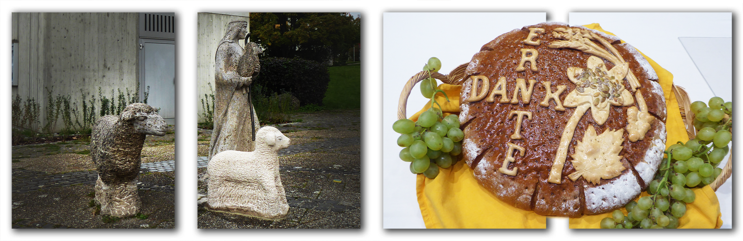 Gott erschafft Tiere, Menschen, Schafe und Hirten. Der gute Hirte, er ist draußen vor der Kirche. Er trägt ein kleines Schaf auf dem Arm. Ein großes Schaf steht neben ihm. Dieses beobachtet, was passiert. Manchmal spricht das große Schaf darüber. Ich höre ihm zu und schreibe auf, was es gesagt hat. Hier ist sie, die Predigt des Schafs. Wir drei – der gute Hirte, das kleine Schaf und ich – wir freuen uns riesig. Wir haben Nachwuchs bekommen. Ein kleines Schäflein ist da. Wir sind jetzt zu viert. So eine Freude! Wir drei – der Hirte, das Lamm auf seinem Arm und ich – wir werden heiß geliebt. Vor allem die Kinder haben uns in ihr Herz geschlossen. Wenn sie zum Kindergarten kommen oder abgeholt werden, wenn sie über den Kirchplatz rennen, dann bin vor allem ich gefordert. Alle wollen sich auf mich draufsetzen. Was für ein Gedränge rund um mich herum! Das macht richtig Stress, aber vor allem ganz viel Freude. Die Kinder erfahren ganz viel über den guten Hirten, über das kleine Lamm, auf das er besonders aufpasst, und natürlich über mich, das große Schaf, auf das man sich draufsetzen darf, belastbar, stark, unbeugsam, tragfähig, zuverlässig, immer da, auch bei Wind und Wetter. So sind wir halt, wir Schafe und vor allem: So ist auch unser Hirte, der gute Hirte. Schon auf dem Kirchplatz kann man uns kennenlernen, auch Leute, die nie in die Kirche kommen oder ins Gemeindehaus. Wir sind nicht zu übersehen, wir Schafe und unser guter Hirte. An uns kommt keiner vorbei. Allerdings gab es da ein Problem. Ich bin ziemlich groß. Sich auf mich draufsetzen ohne Hilfe von Erwachsenen, das können nur große Kinder. Was aber machen die kleinen, die ganz kleinen? Gut, die Eltern können helfen. Trotzdem wäre es schön, wenn die Kleinen allein zurecht kommen würden ohne fremde Hilfe. Selbst aufsteigen können auf das Schaf, das wäre doch was, dachte sich ein Mitglied unserer Gemeinde, das nicht genannt werden will. Wie wäre es, wenn es noch ein kleines Schaf gäbe, neben mir, dem großen Schaf? Besagtes Gemeindemitglied hat beschlossen: Ich schenke der Gemeinde ein kleines Schaf, so klein, dass auch kleine Kinder allein darauf Platz nehmen können. Für dieses großzügige Geschenk danken wir herzlich. So ist das bei uns in der Kirche. Die Herde wird größer. Ebenso danken wir Frau Karin Breidbach, die das neue Schäflein entworfen, und Herrn Johannes Vogel, der es gefertigt hat. Wir freuen uns heute so wie damals, als zuerst der gute Hirte auf den Kirchplatz kam, mit dem Lamm auf dem Arm, und dann kam ich. Freilich, die Freude war damals nicht ungetrübt. Einige sagten: Wie kann man so etwas machen, so viel Geld ausgeben für ein Kunstwerk in unserer Zeit, wo so viele Menschen Not leiden? Ist das christlich? Wir – Schafe und Menschen – wir sind uns einig: Wir tun so viel für Menschen in Not hier bei uns und in der Welt. Wir haben aber auch den Auftrag, das Evangelium zu verkünden hier bei uns. Das tun wir in der Kirche und vor der Kirche. Wer über den Kirchplatz geht, kann ihn sehen und anfassen, den guten Hirten. Er sorgt für alle, nicht nur für die in der Kirche. Und ein Geschenk, ein neues kleines Schaf, das darf man nicht ablehnen. Wir nehmen es an und sagen: Danke. Vergelts Gott.